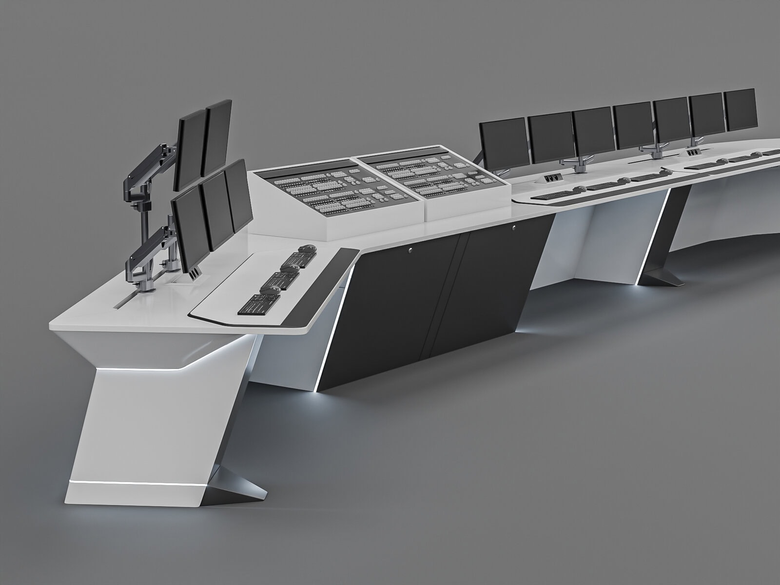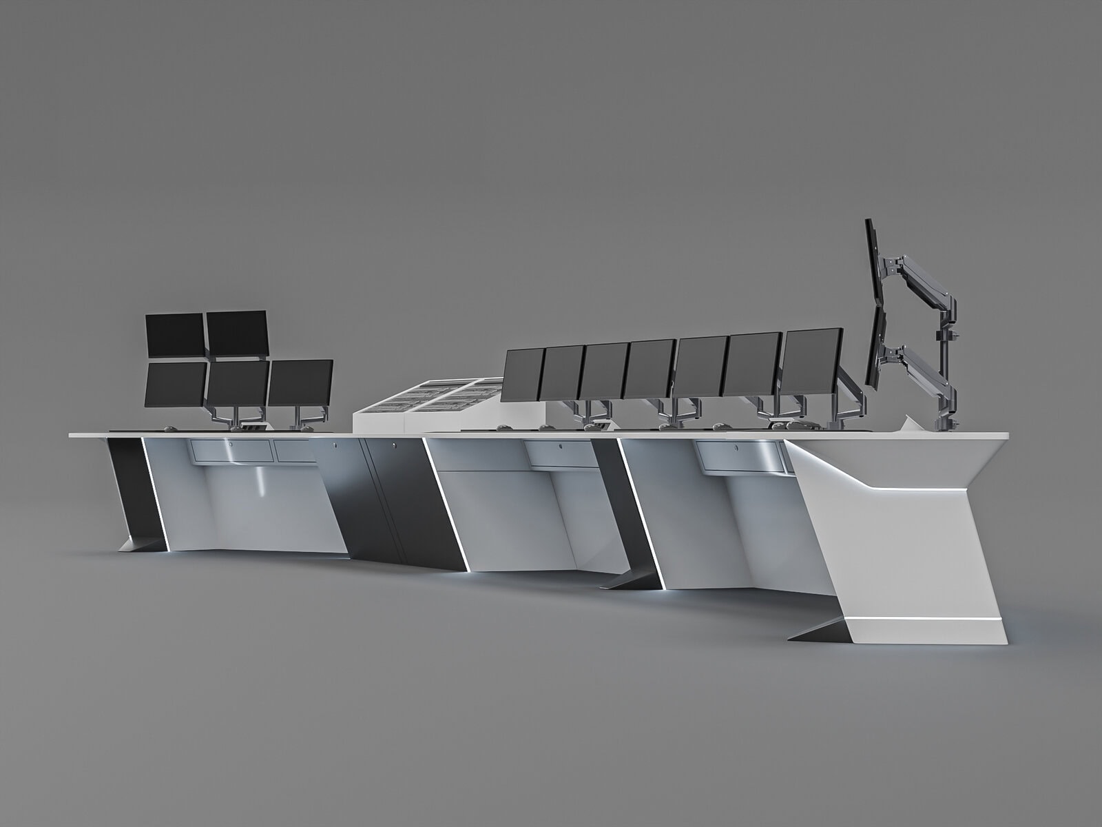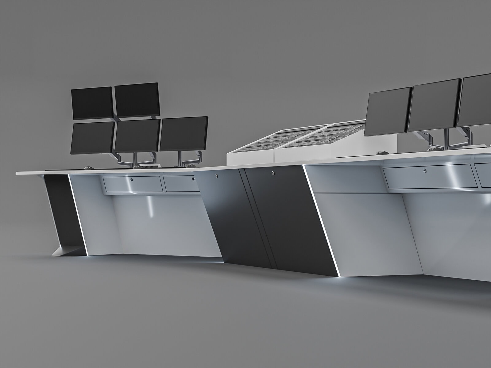 Task: Develop a modern design for a control desk with several important constraints: very tight deadlines covering the entire project from design to installation; the desktop had to be monolithic. In addition, once the contract was signed, it was necessary to oversee production, delivery, and installation.